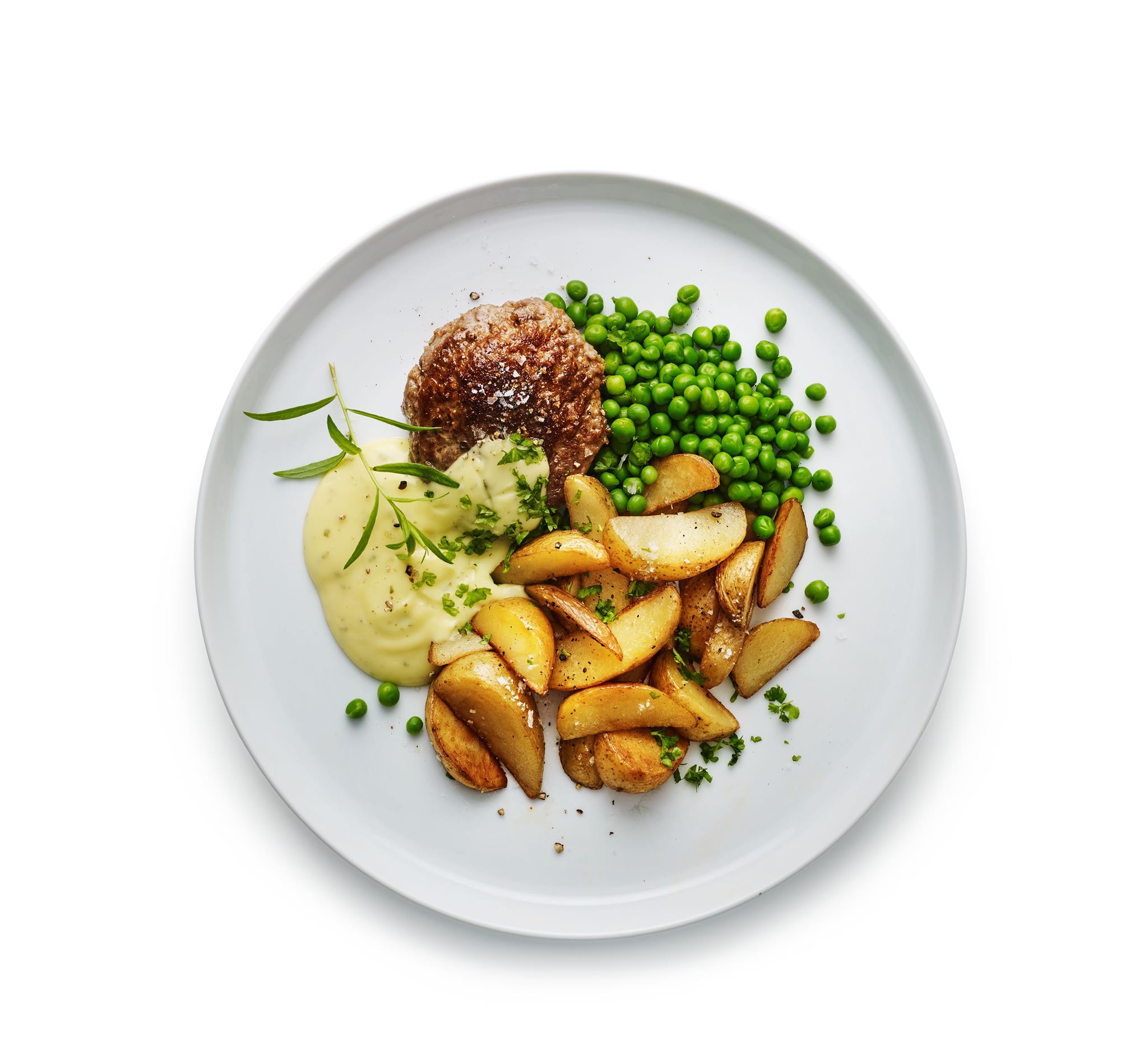 med bearnaise, kartofler og ærter.